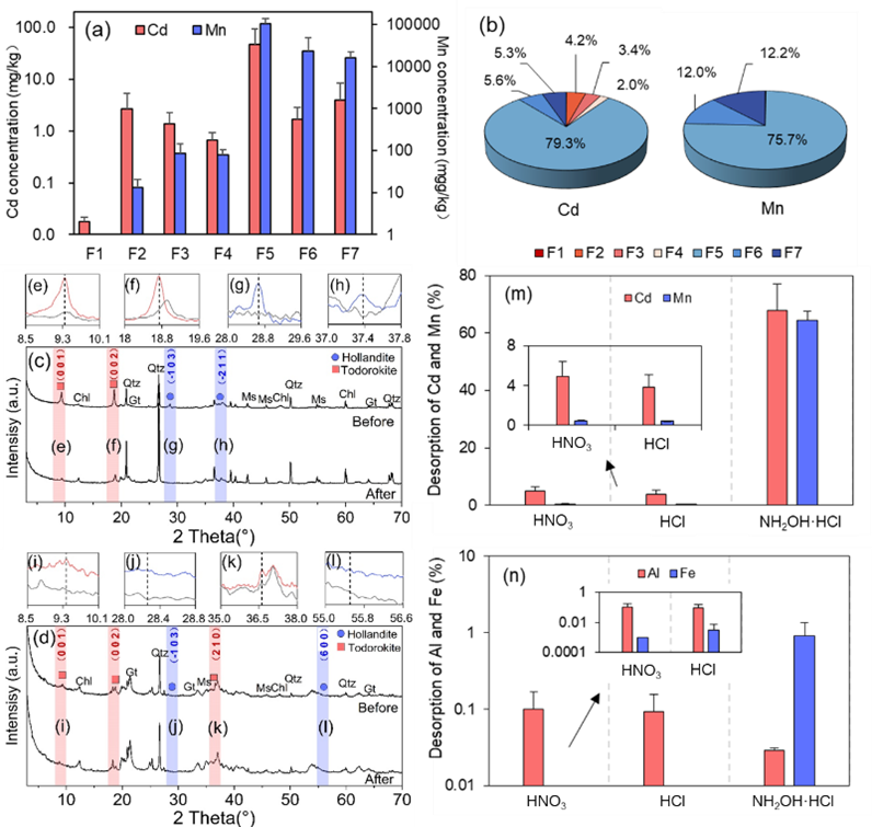 图2 富锰结核Cd和Mn的顺序提取的浓度(a)和比例(b);盐酸羟胺提取前后XRD谱图(c)、(d); 局部放大后锰矿物晶面特征峰的变化(红色和蓝色分别代提取后的 XRD 图谱)(e)-(j);NH2OH-HCl 提取后Fe、Mn、Al和Cd的浸出比例 (m)、(n)。