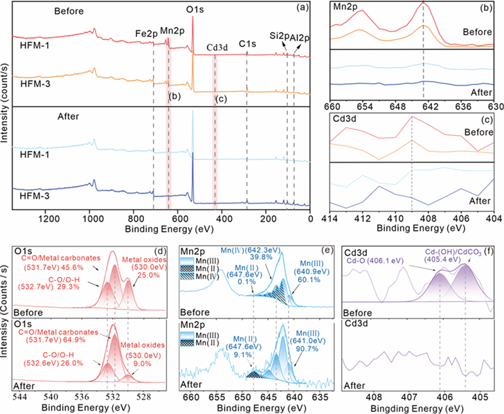 (a:XPS总谱图;b、c:Cd3d和Mn2p放大后的谱图;d-f:O1s、Mn2p和Cd3d的精细谱图)